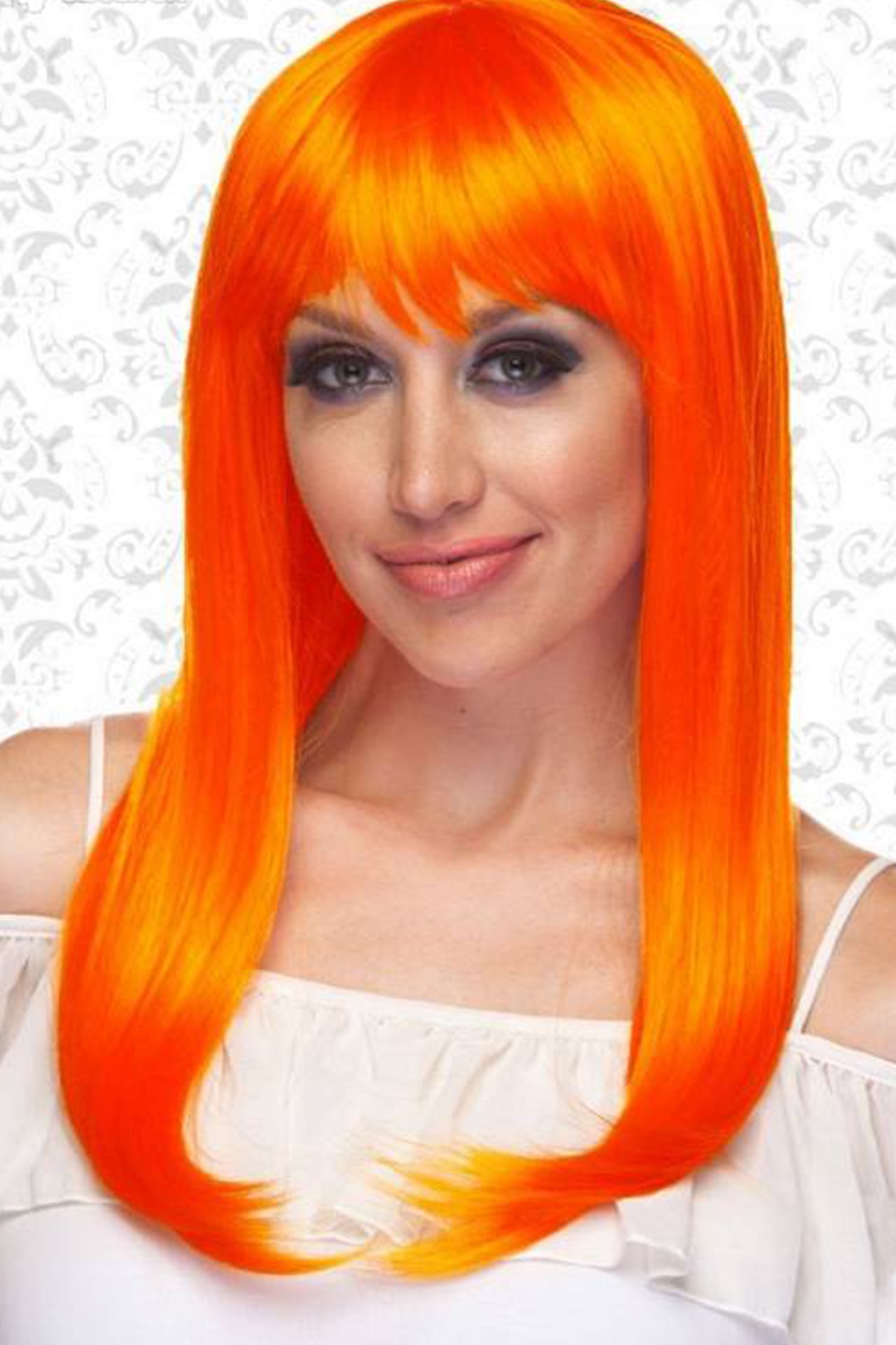 Perücke in Orange mit einem Ponnyschnitt, passend zu einem unserer Kostüme. Perfekt für die Fasnacht oder Karneval.